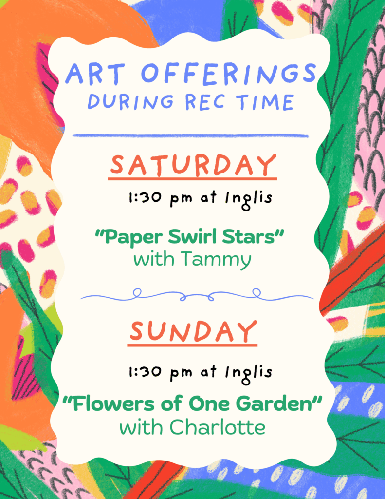 - Dietary Restrictions: Please ask at cafeteria for your special meal (vegetarian, vegan, GF, DF). For snacks in Inglis, you may ask snack team.